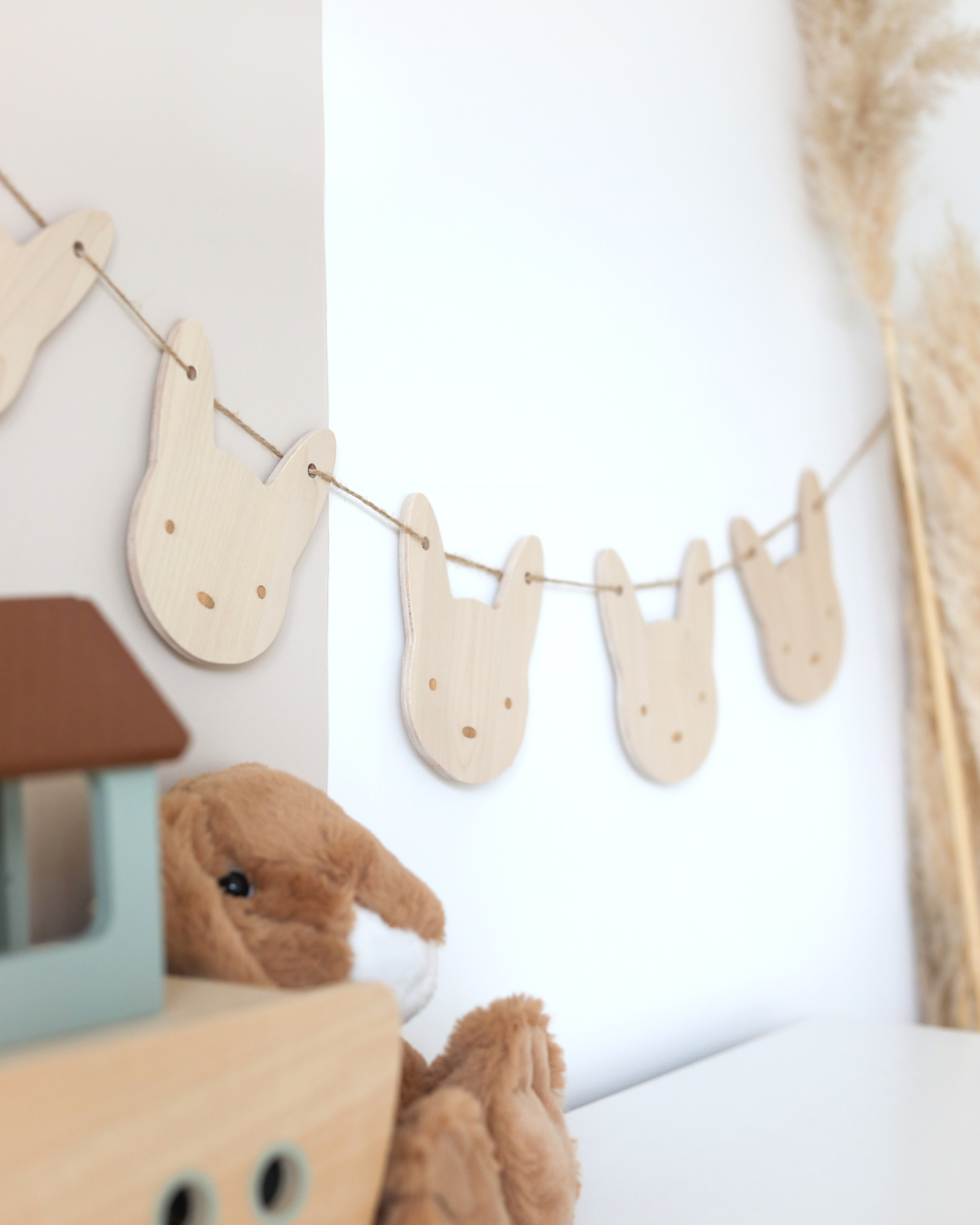 This bunting comes with 5 pieces of wooden bunny tie with a string, ready for hanging, it’s perfect for adding rustic charm to any space.