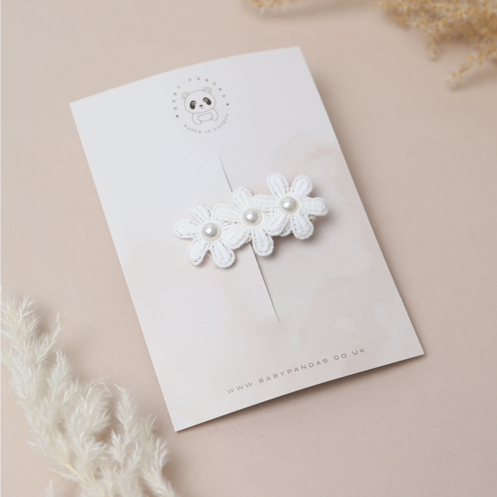 Introducing the Parie Hair Clips, featuring three daisy flowers in classic white. Ideal for weddings, birthdays and christenings, these accessories add sophistication and charm to any hairstyle. Perfect for creating refined, stylish looks, they're essential for special occasions.